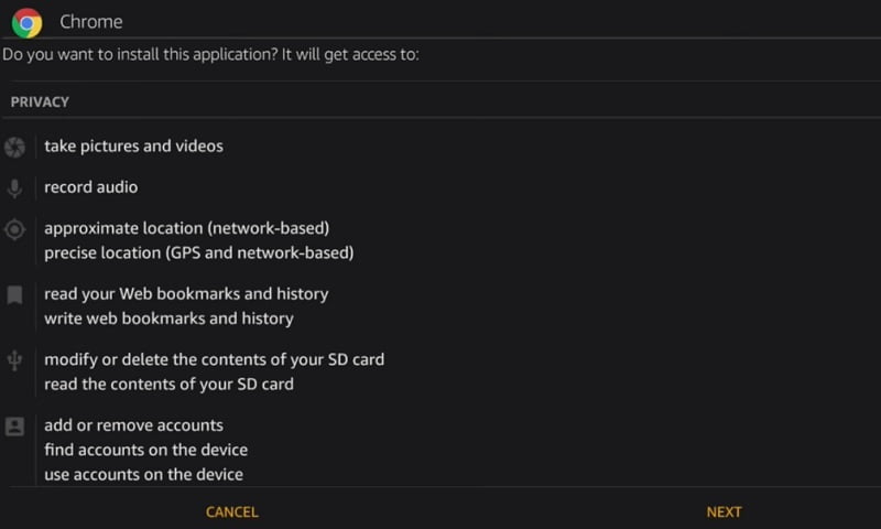 - Tap on Next button and then press Install to allow installation of Chrome app.